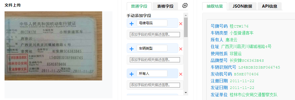 关键字段提取:通过关键字匹配或语义分析,将识别出的文本自动归类到“车主”、“车牌号”、“注册日期”、“品牌型号”等预设字段中。
