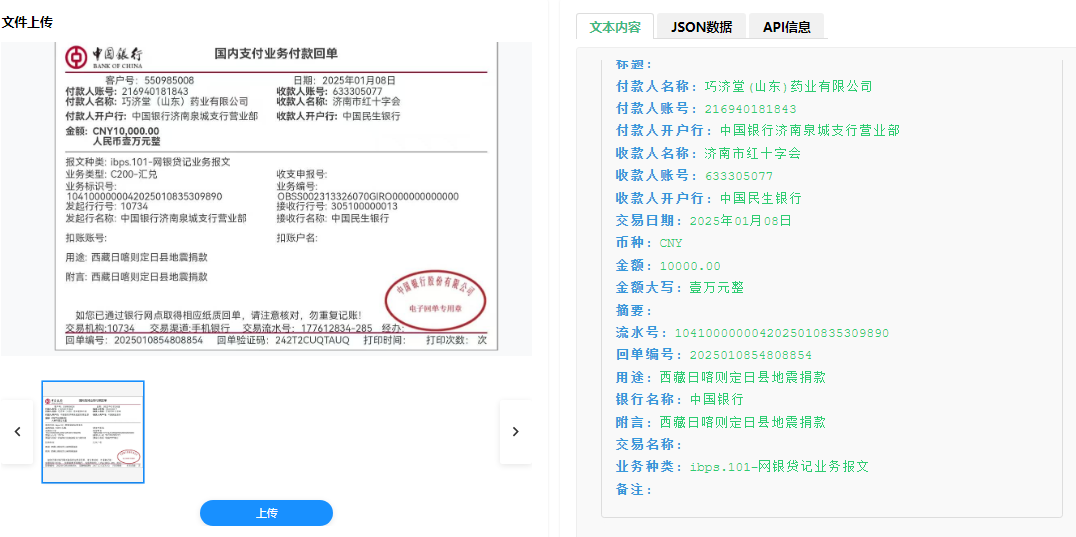 1.多版式自适应与复杂场景识别:国内各银行回单格式千差万别,即使是同一银行,对公业务与对私业务、不同时期的回单样式也可能不同。银行回单识别技术采用先进的文档结构分析和深度学习模型,无需预先定义固定模板,即可自动定位回单上的关键区域(如付款人、收款人、账号、金额、日期、用途等),实现对数百家银行不同版式回单的高精度自适应解析。