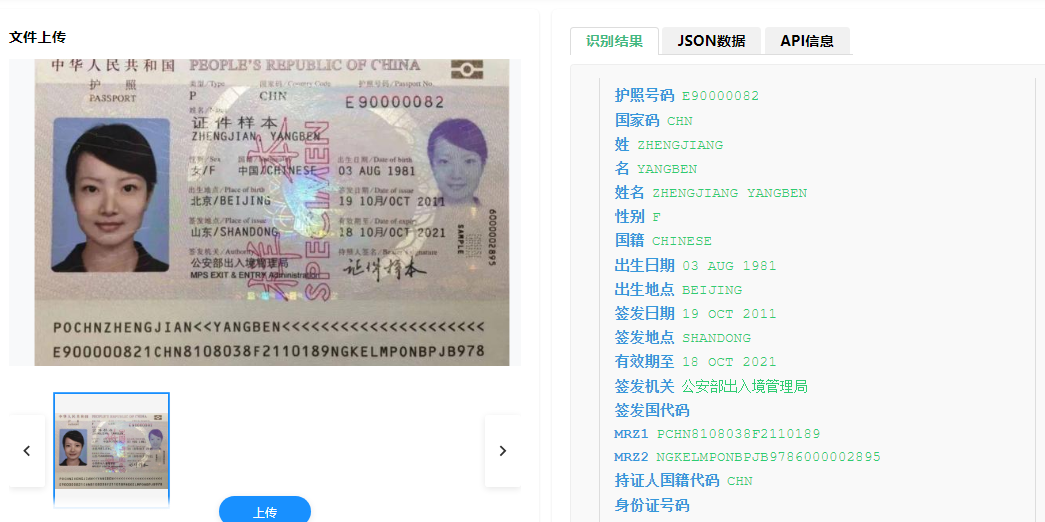 数据提取与结构化:识别出的零散文本信息被自动提取,并按照预设的字段(如Name, Passport Number, Date of Birth等)填入结构化的JSON或XML数据中,方便后端系统直接调用。