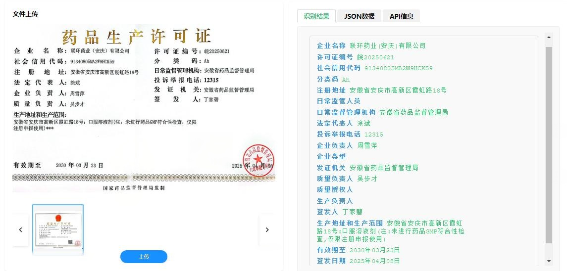 快速提取信息:通过手机、扫描仪等设备拍摄许可证图像,瞬间识别并结构化提取企业名称、许可证编号、生产地址、有效期、生产范围等关键字段。