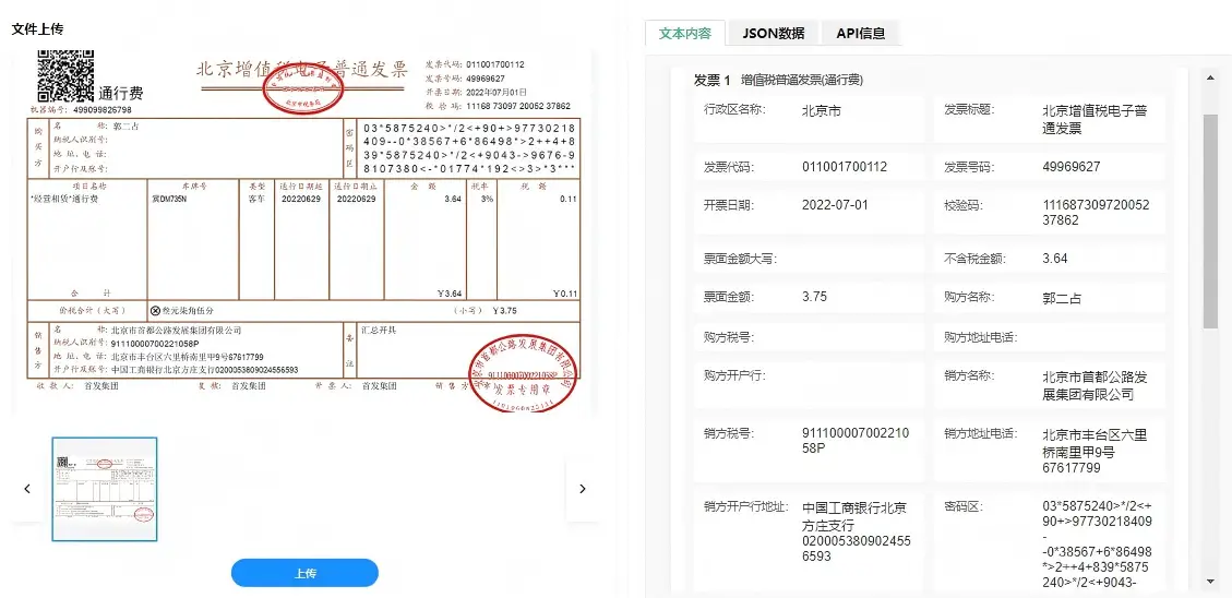 结构化信息秒级提取:系统不仅能识别文字,更能精准定位并提取关键字段,如发票代码、号码、开票日期、金额(含税/不含税)、销售方/购买方信息、商品明细、税率等,并将其自动转化为可直接使用的结构化数据,为后续处理奠定基础。
